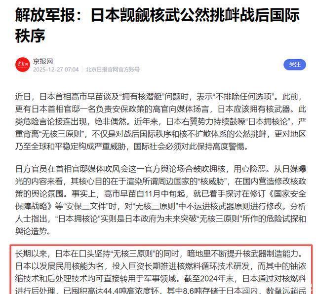日本是否已经拥有核武器?它自己始终否认,但从核原料储备、技术积累、军备扩张到外交动作,每一步都在传递“随时可以拥有核武器”的信号,显然,日本正以这种方式豪赌自己的国运。 历史早已证明,违背和平潮流、妄图通过军事扩张实现野心的国家,最终都会走向灭亡,日本作为二战战败国,本该铭记历史教训,维护地区和平稳定。