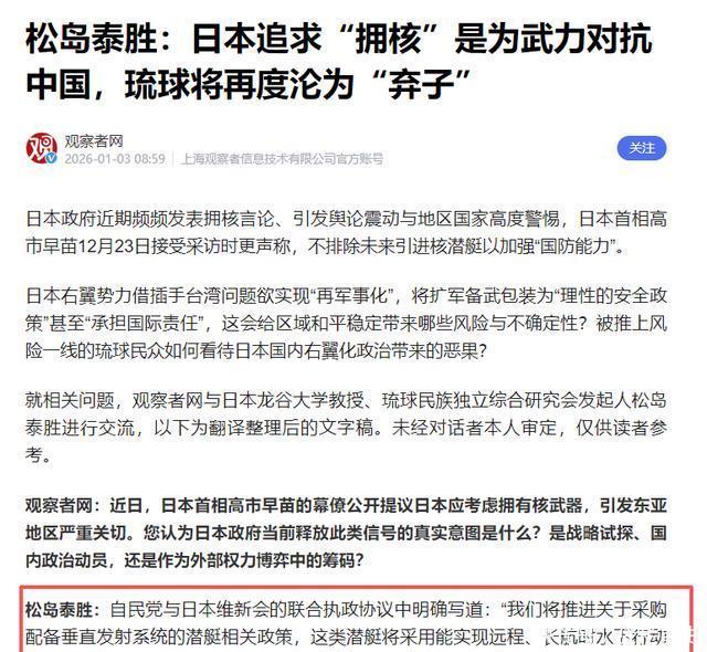 别觉得这事离自己很远,关系其实大到影响每个人,要是日本真的暗中造出核武器,普通人的工作节奏、生活安稳,乃至下一代的未来发展,都会被彻底打乱。 把这些碎片化的信息串起来就会发现,日本早已不是大众印象中那个低调内敛的国家,它的核底牌已经渐渐露了出来,甚至官方已经报道出来,与日本龙谷大学教授、琉球民族独立综合研究会发起人松岛泰胜进行交流时, 对方表示日本想要“拥核”,最终目的就是为了用武力来对抗中国。