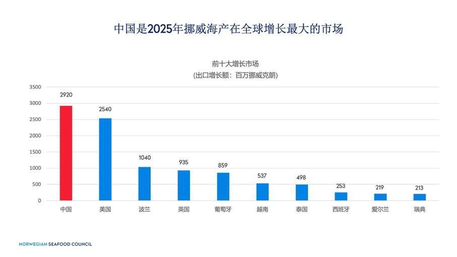 其中,中国消费者对优质挪威海产的需求稳步上升。2025年,挪威对华海产出口量达到17.8万吨;出口额创历史新高,达123亿挪威克朗。凭借这一表现,中国市场从2024年的第六位上升三位,首次跻身挪威海产全球前三大出口市场。同时,中国也是2025年挪威海产全球增长最大的市场,出口额同比增长29亿挪威克朗,涨幅为30.9%。