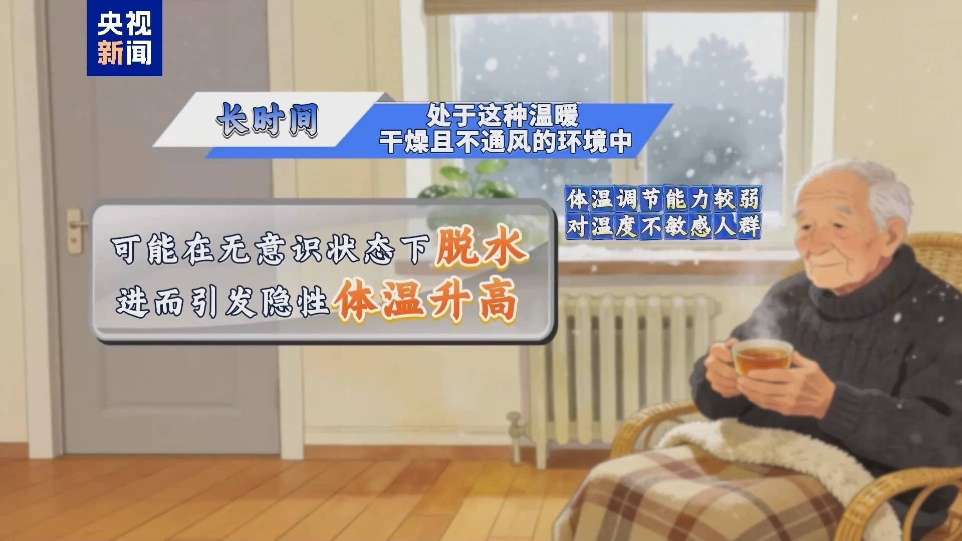 专家提醒,冬季室内供暖后,尤其是北方地区室温常维持在25℃以上。若长时间处于这种温暖、干燥且不通风的环境中,体温调节能力较弱、对温度不敏感人群可能在无意识状态下脱水,进而引发隐性体温升高。